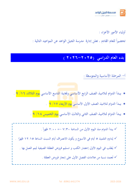 أهالينا الكرام نرجو منكم الاطّلاع على مواعيد الصفوف الافتراضية وتوزيع المواد الخاص بكل صف وذلك